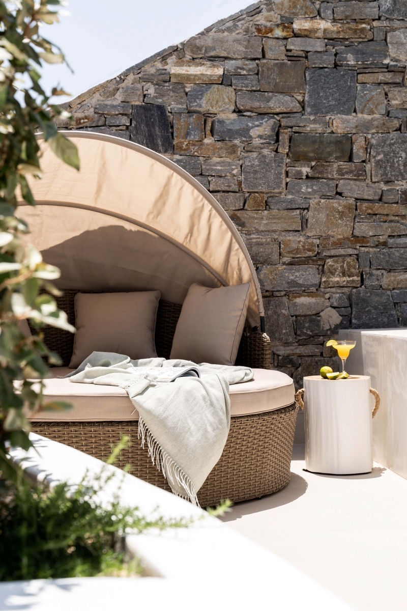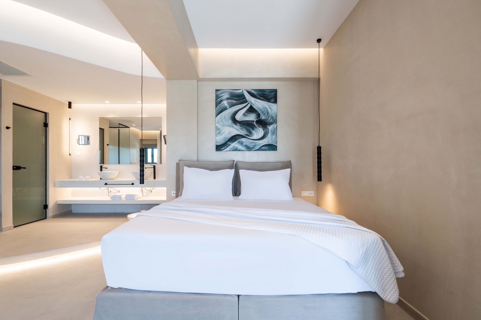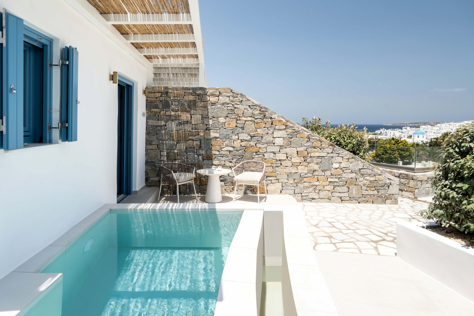 Integrating contemporary design into Cycladic aesthetics and created with natural, local materials, the Honeymoon Suites with Private Pool are the ideal setting for couples to enjoy moments alone. The interior spaces offer premium luxury with all modern comforts, while the outdoor grounds boast breathtaking views of Naoussa village and the gleaming sea, enjoyed from the magnificent sun deck with a private pool and loungers for deep relaxation.